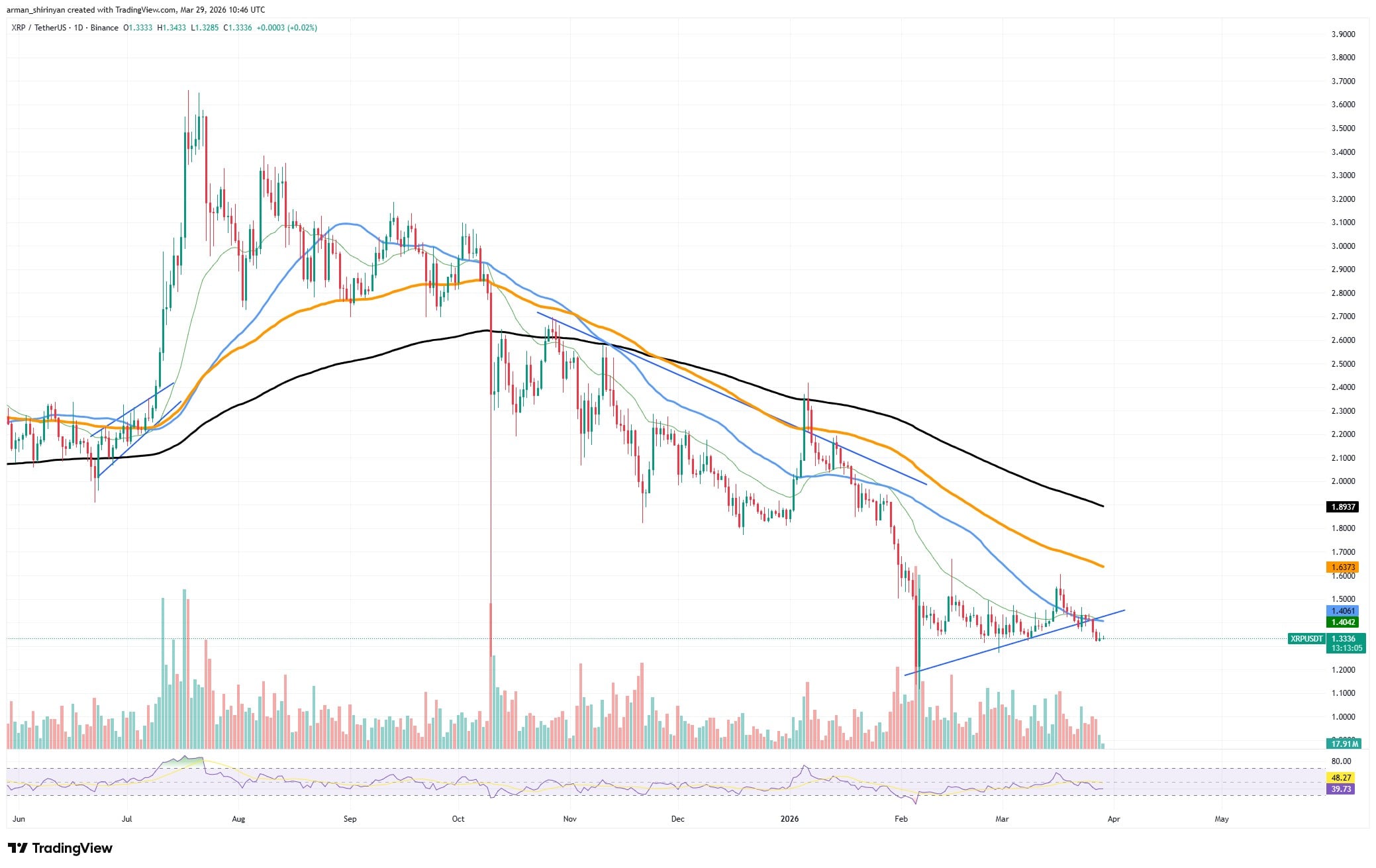 $XRP’s price is still clearly in a downward trend, with declining moving averages consistently rejecting it and lower highs. The asset recently tried to break out from a short-term ascending support trendline, but it was unable to maintain momentum and fell back toward the $1.30-$1.35 range. Currently, this region serves as a vital support zone. A breakdown below it would probably lead to the $1.20 area, which is consistent with previous lows in 2026.
