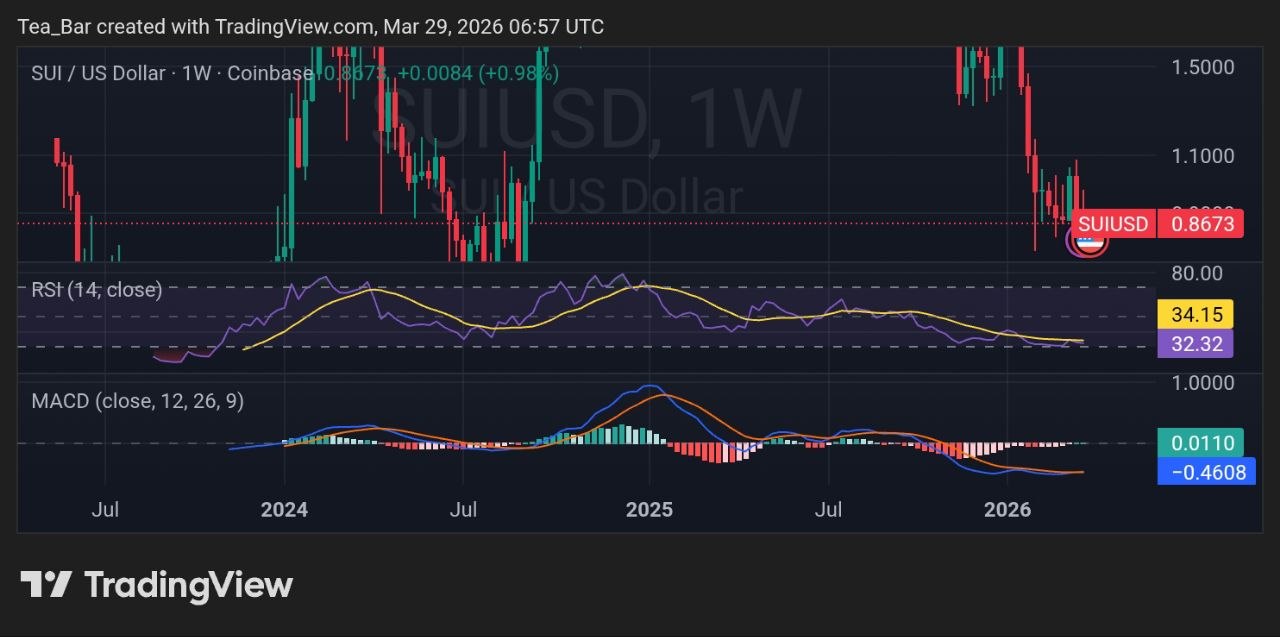 $SUI’s technical structure indicates the asset may be nearing a turning point. On the weekly timeframe, the Relative Strength Index (RSI) sits between 32 and 34, placing it firmly in oversold territory.