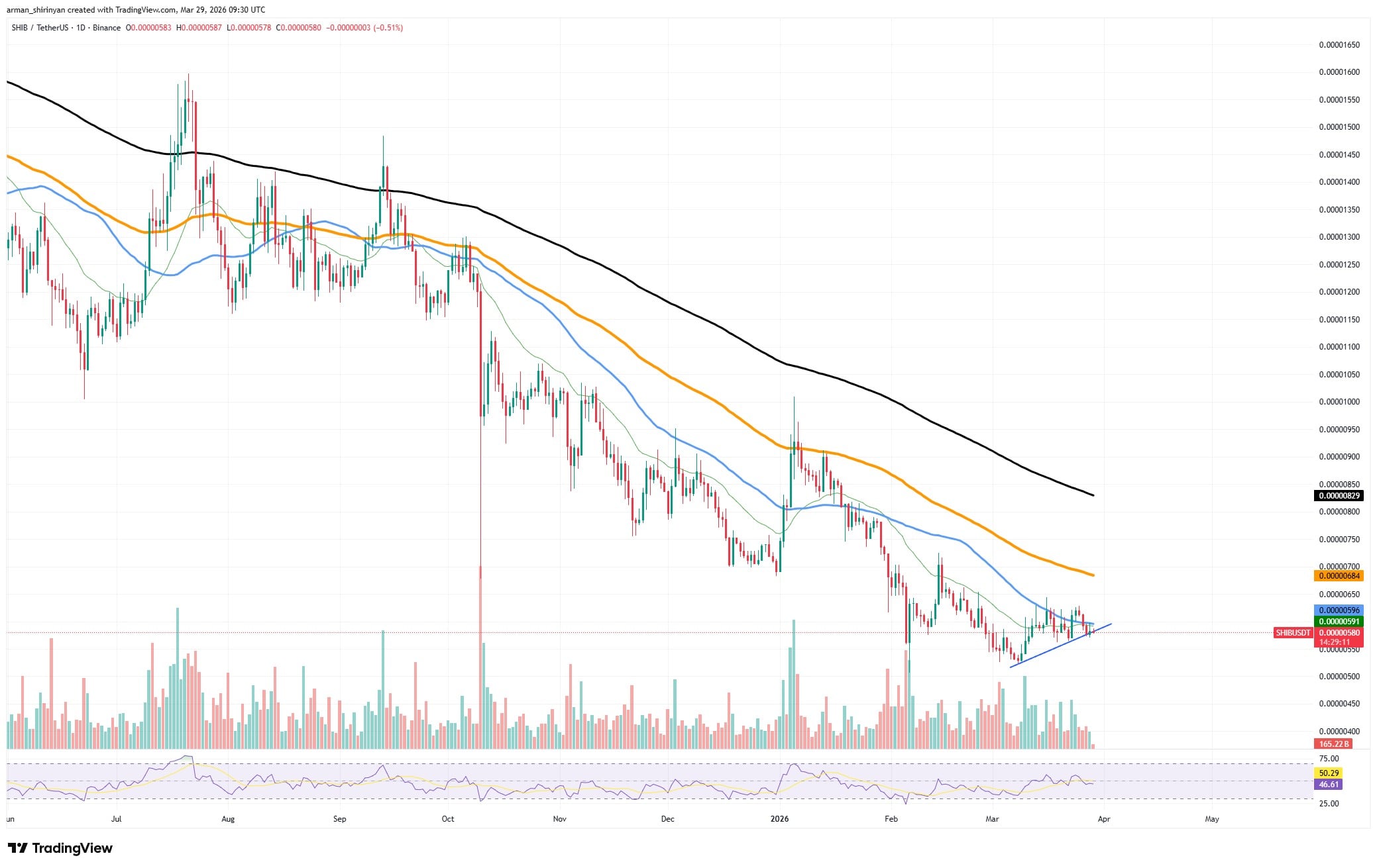 Although the structure is starting to compress, $SHIB is still technically in a downward trend on the price chart. Since its most recent bottom, the asset has developed higher lows and a local ascending support line. After a protracted decline, this is the first positive pattern, but it is not a confirmed reversal. Additionally, the price is trying to recover short-term moving averages, which have served as dynamic resistance for several months.