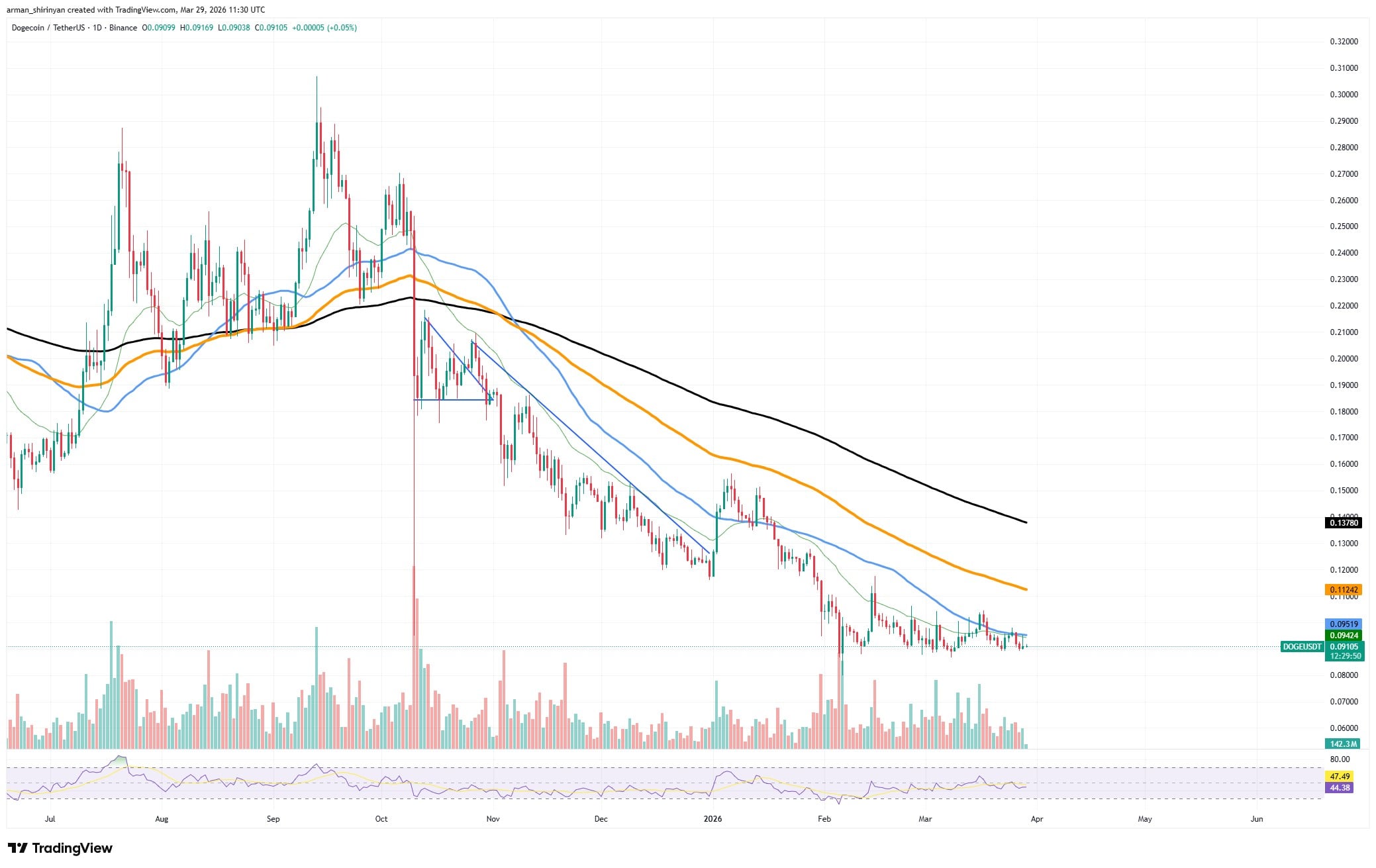 With steady lower highs and robust rejection from important moving averages, the chart displays a distinct bearish trend that has persisted for months. As of right now, $DOGE is consolidating close to local lows while remaining slightly below the $0.10 mark.