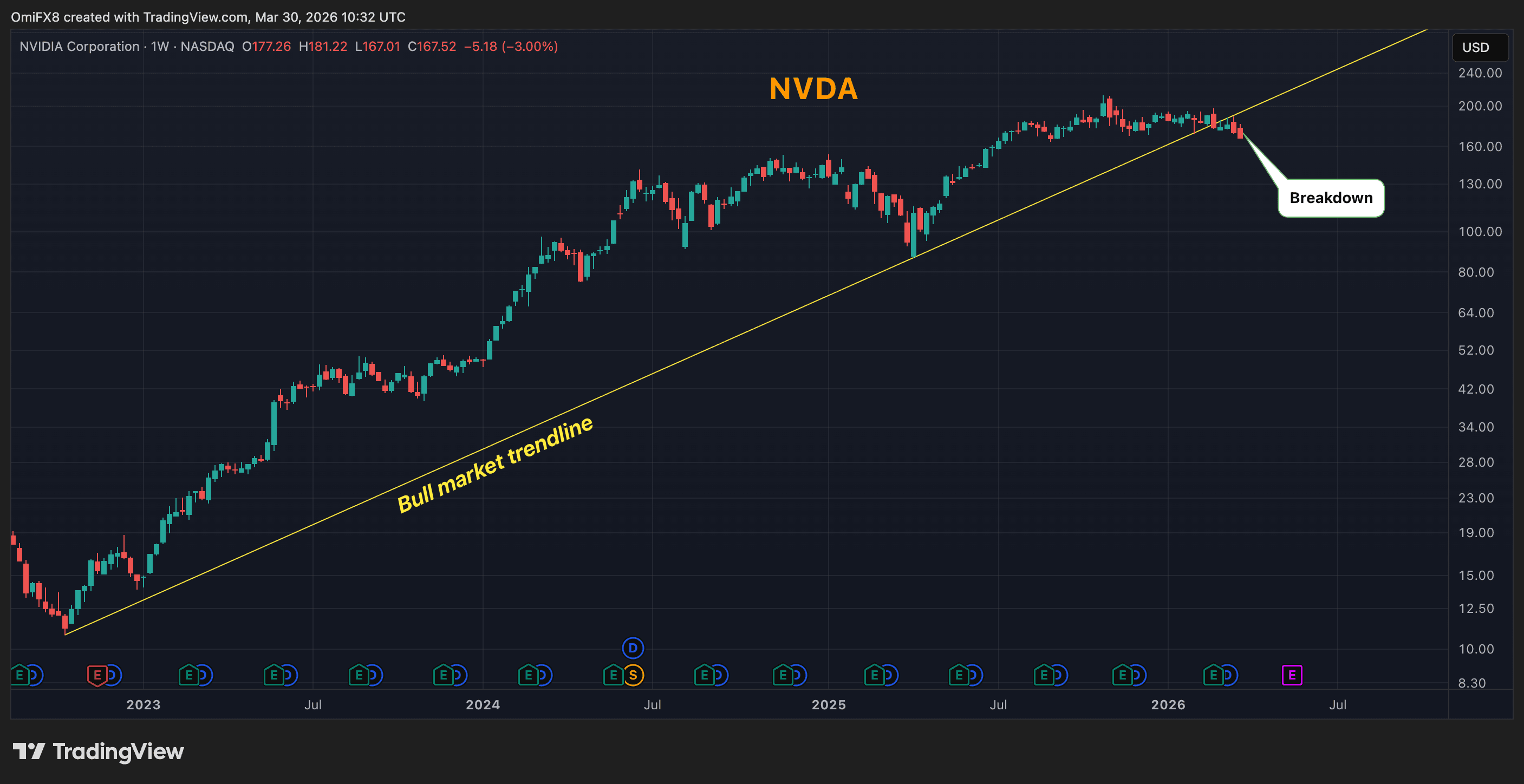 - The chart shows weekly price swings in Nvidia (NVDA) in candlestick format.