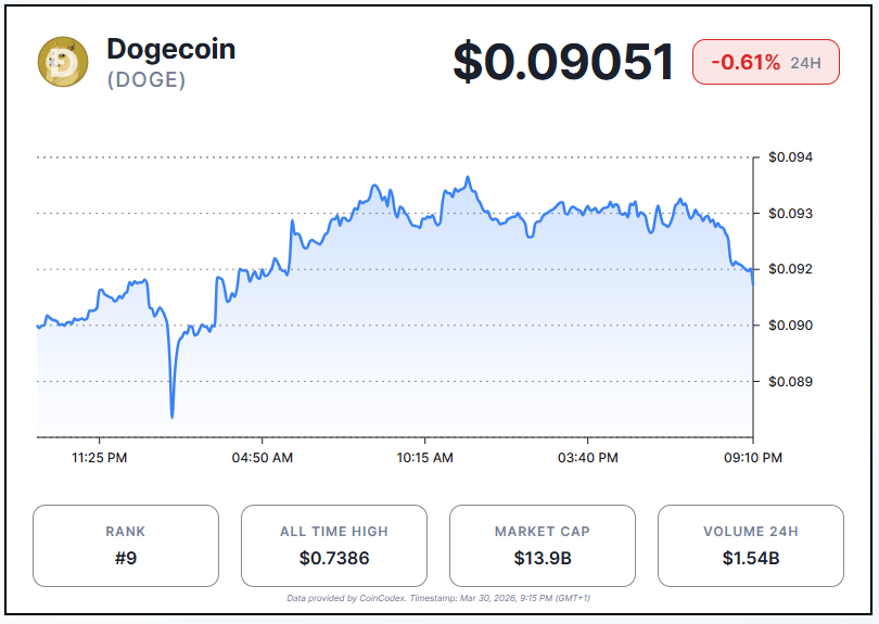 Dogecoin is trading at $0.09051 at the time of writing, down 0.61% over the past 24 hours. A descending triangle pattern has formed on the chart, and two key support levels have already collapsed. The broader crypto market recovery has done little to lift $DOGE out of danger.