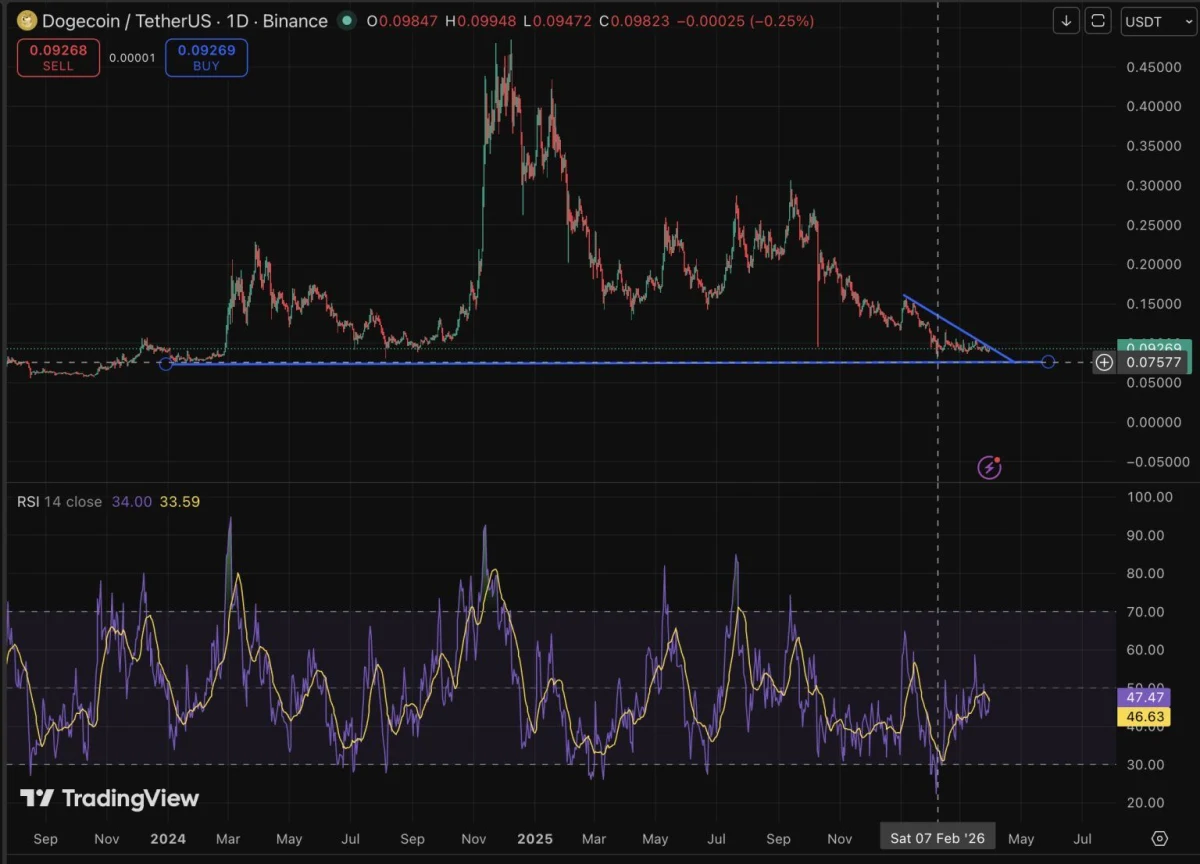The bear case carries the most weight given the current positioning. If the triangle resolves to the downside, which the 98% long liquidation rate suggests the market already anticipates, a measured move of 29% from the pattern puts $DOGE near $0.075. That level represents a significant drawdown from current prices and would likely trigger another wave of forced liquidations.