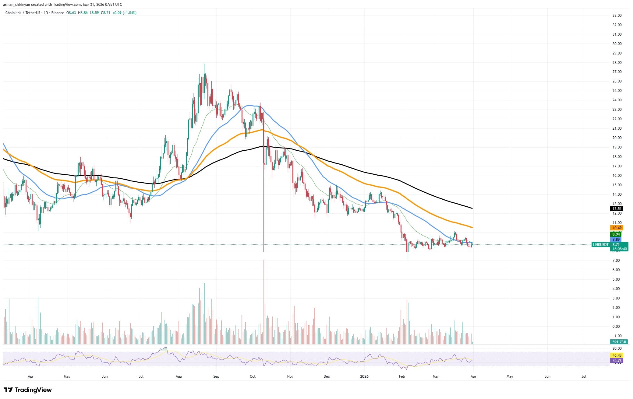 Considering how low participation has been in recent weeks, the recent 18% increase in 24-hour volume is what's important. After a decline from the $20+ region, $LINK is currently consolidating in the $8.60-$8.80 range from a price standpoint.