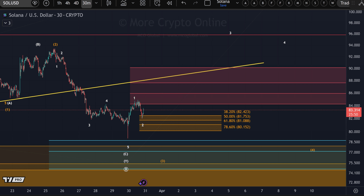 Morecryptoonl highlights that the recent bounce from the $74–$78 zone lacks strength. The move formed a three-wave corrective structure, which typically signals a temporary reaction. Moreover, resistance between $84 and $90 continues to cap upside attempts.