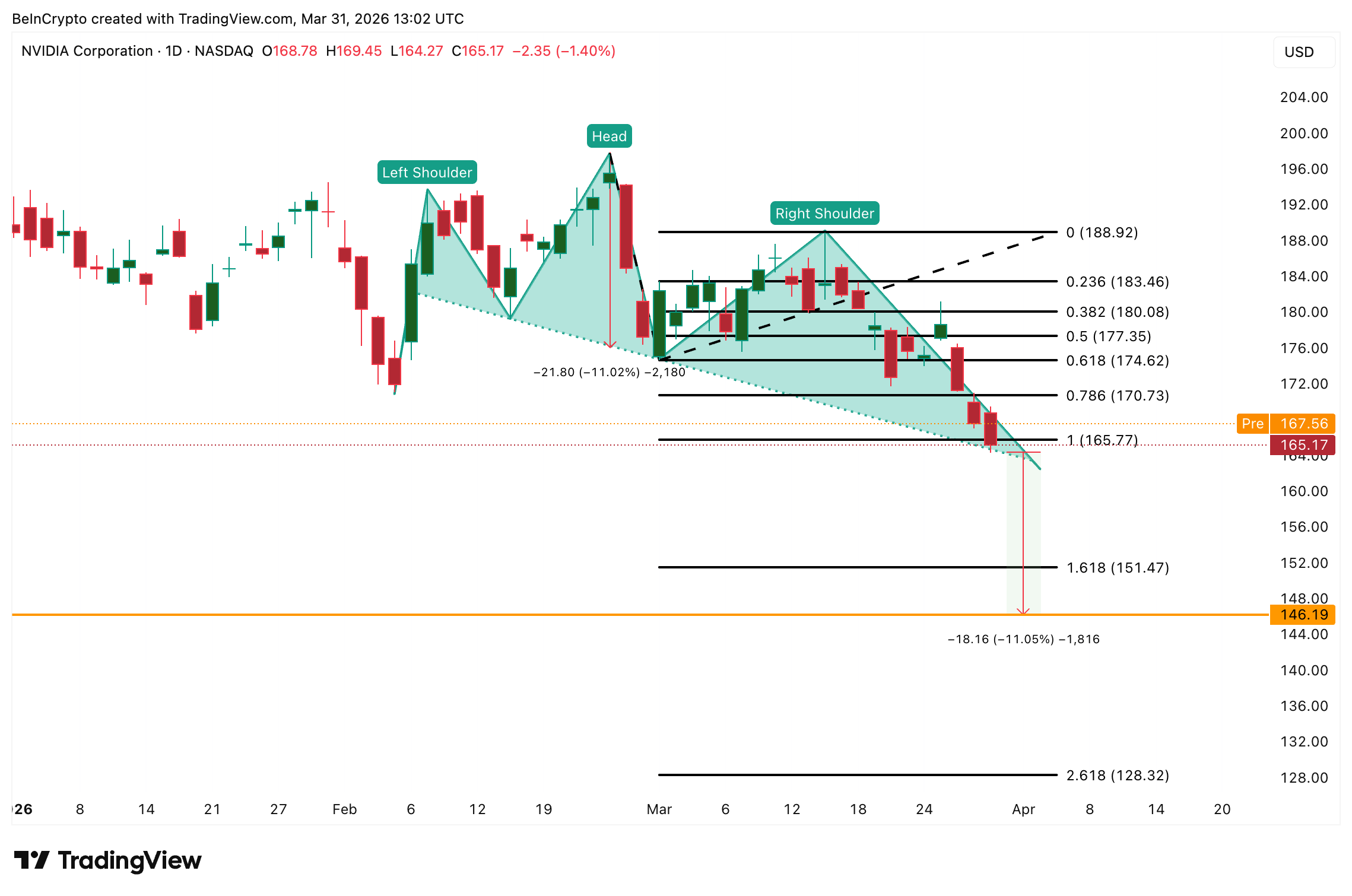 Nvidia (NVDA) stock closed above $165 on March 30, down over 9% since March 25. It now sits directly on the neckline of a head-and-shoulders pattern that projects an 11% measured breakdown if it fails.