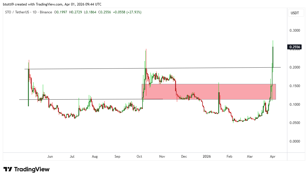 The price of $STO surged from $0.11 to $0.26 today, a 136% increase.