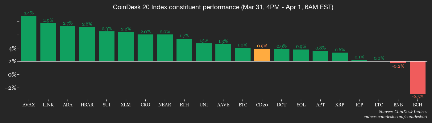 Ether has risen 5% over the past 24 hours, outpacing bitcoin , $XRP ($XRP), solana (SOL), and the CoinDesk 20 Index. Several smaller tokens associated with quantum-computing-resistant technology have rallied by 20% or more.