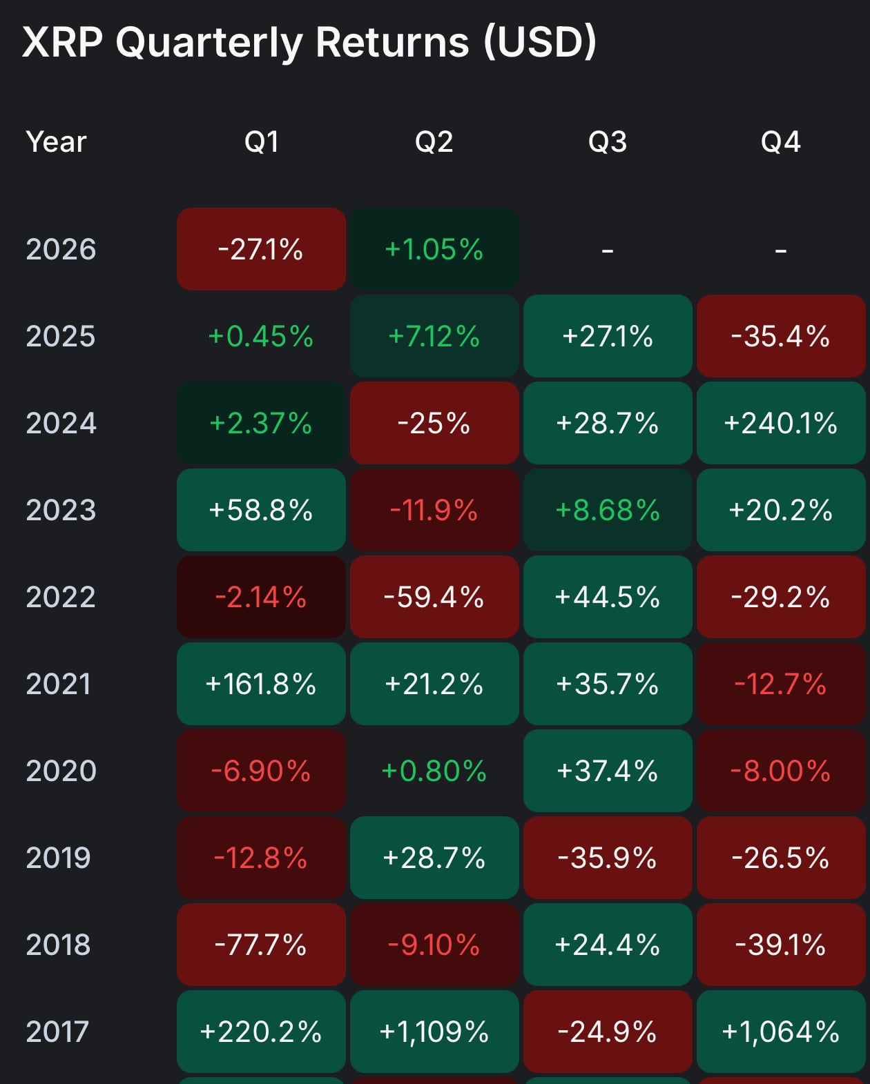 $XRP dips 27% in Q1, 2026