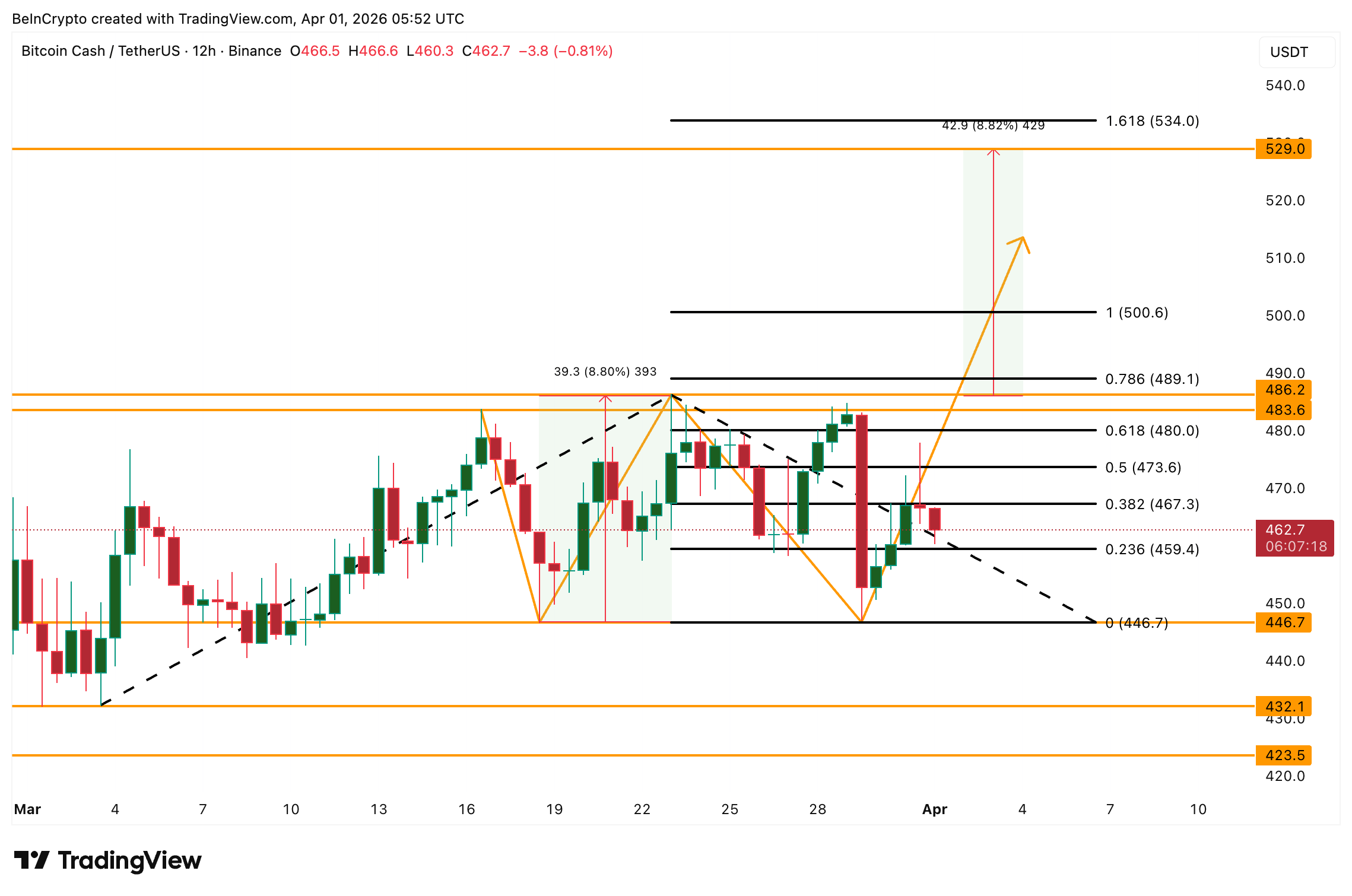 The trigger is visible on the 12-hour chart. $BCH is forming a double bottom structure with a measured move of approximately 8.80%. The pattern confirmed around March 29, the same day whale accumulation surged. The neckline sits near $486.20. A move above $489.10 would cleanly confirm the breakout and open a path toward the $500 psychological level, followed by $529 and potentially $534.