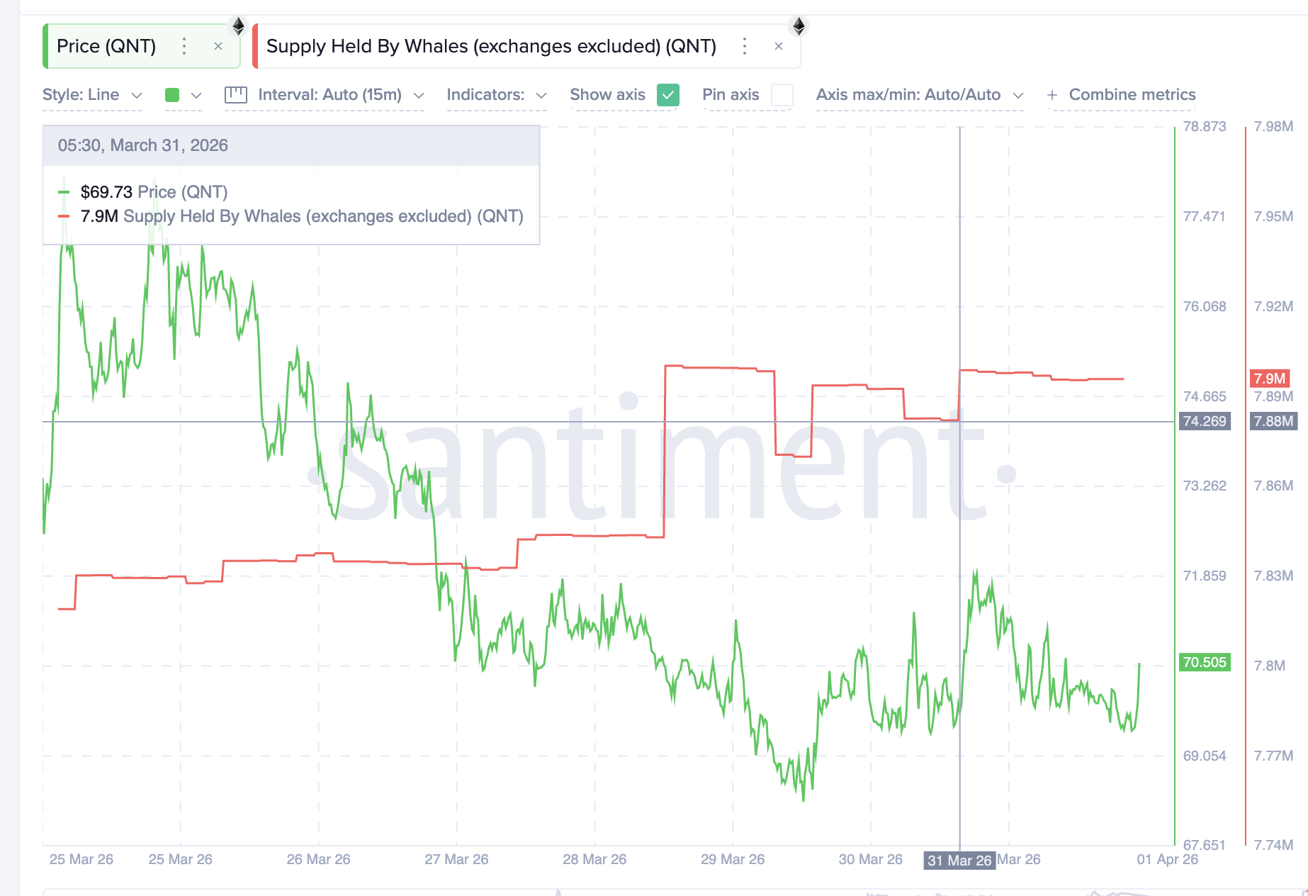 Whale-held supply rose from 7.88 million to 7.9 million $QNT since March 29, according to Santiment data. That addition of approximately 20,000 tokens is worth roughly $1.4 million at the current price. The accumulation has come in steady bursts rather than a single move, with whales adding on March 29 and again on March 31. Since yesterday, whales have not trimmed their stash, possibly due to a developing bullish pattern.