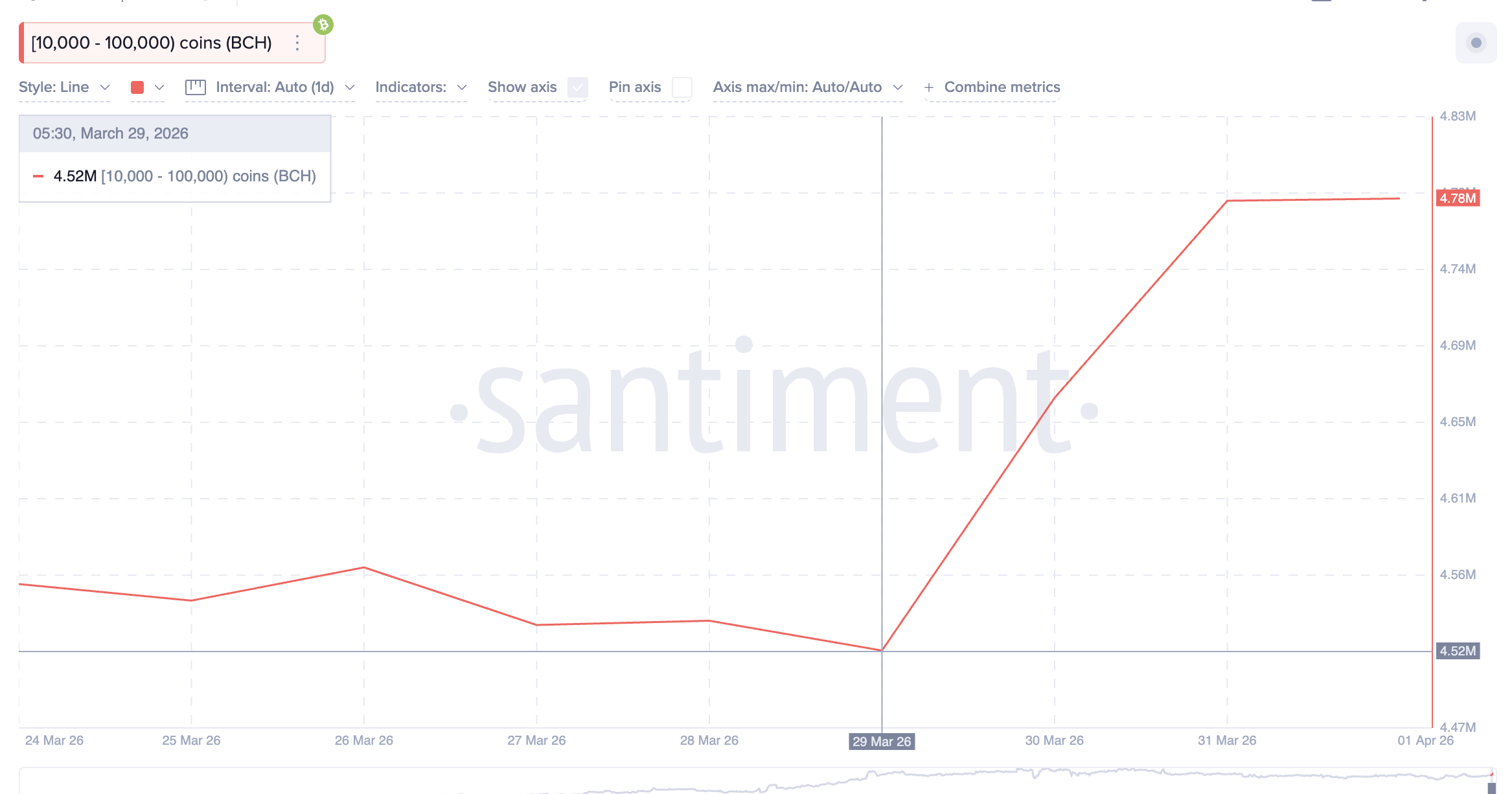 One of the biggest $BCH whale cohorts, wallets holding between 10,000 and 100,000 coins, increased their stash from 4.52 million to 4.78 million $BCH starting March 29. That is an addition of approximately 260,000 $BCH, worth roughly $120 million at the current price.