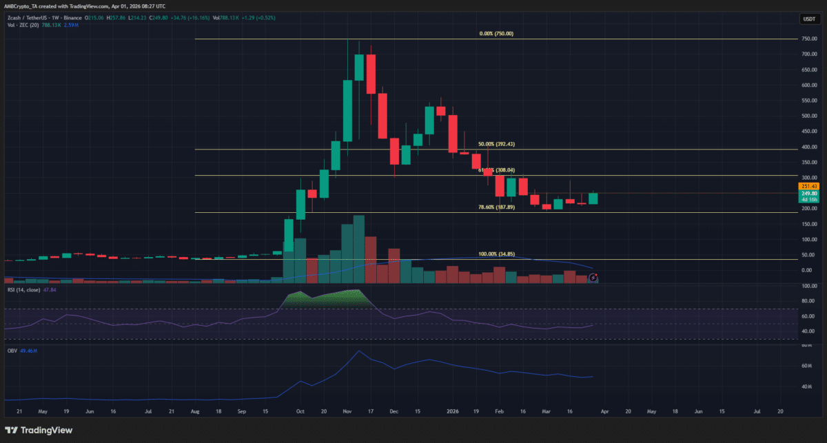 As the weekly chart showed, the $290 and $327 levels were the next targets. A breakout past $250 would add confidence to the bulls. AMBCrypto had reported that ZCash witnessed whale buying and capital inflows recently.
