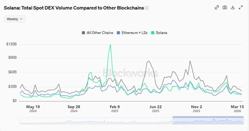 The chart, titled “Solana: Total Spot DEX Volume Compared to Other Blockchains,” shows Solana posting about $13.6 billion in weekly volume in the latest reading. That placed Solana close to the Ethereum plus L2 category, while both tracked well above or near the broader group labeled all other chains during the same period.