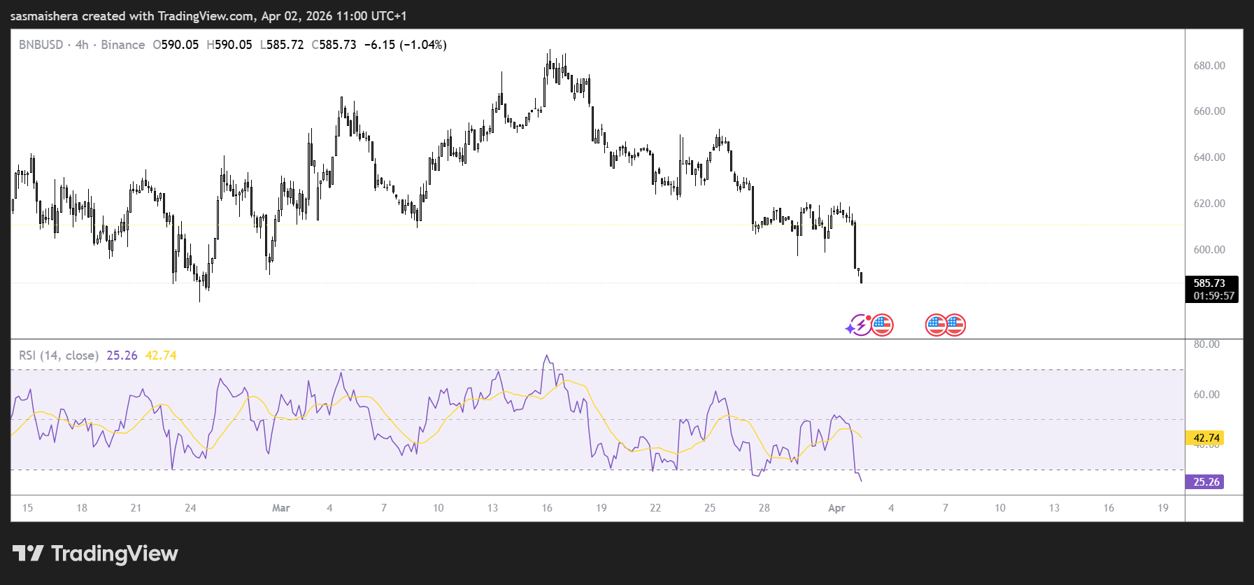 $BNB (formerly Binance Coin) is currently trading below $585 as of Thursday, continuing its three-week decline.
