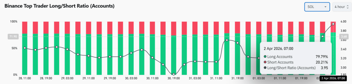 Despite weakness, Binance’s top traders maintained a strong long bias. Around 79.79% of accounts were long, versus 20.21% short.