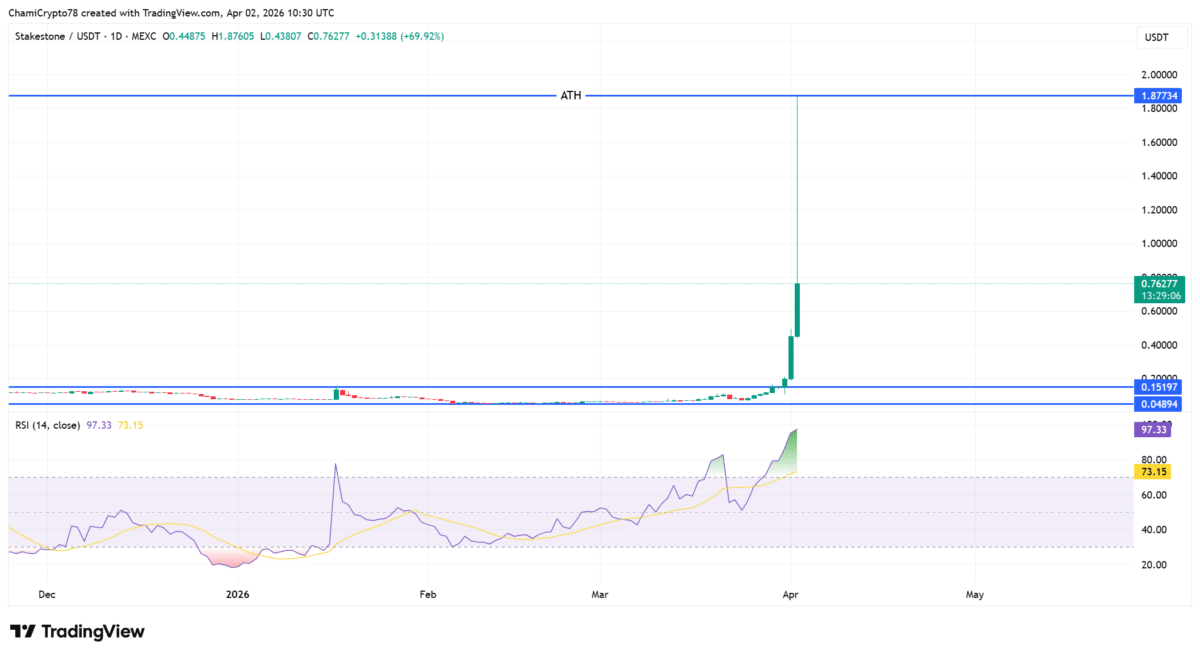 StakeStone [$STO] surged from $0.11 to a peak near $1.87 within two days, delivering a rally of more than 1,600% before sharply pulling back to around $0.76 as volatility spiked. The move followed earlier whale activity, when a newly created wallet withdrew 25.5 million $STO, worth $4.85 million and representing 11.32% of supply, from Binance, tightening exchange.