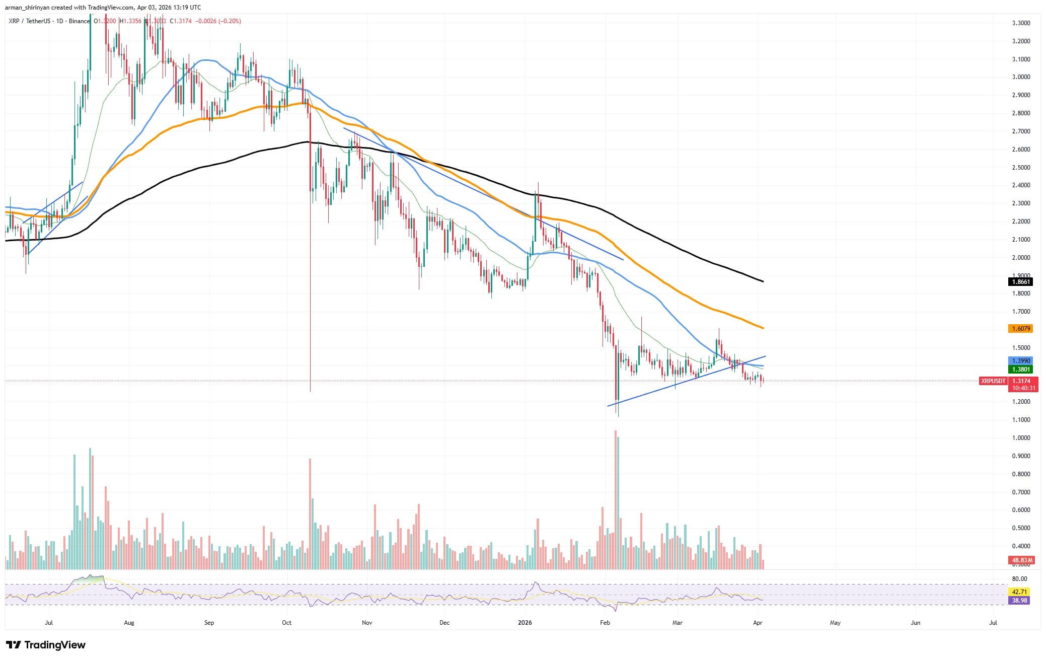 Second, $XRP must create a higher high in order to break its wider descending structure. Moving toward the $1.50-$1.60 area, where there is stronger resistance and a moving average confluence, would probably be necessary to accomplish this. Any upside move would only be a brief bounce, rather than a reversal, in the absence of this structural change.