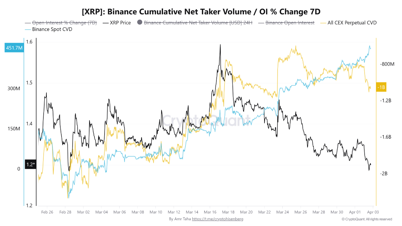A CryptoQuant report has identified a divergence in $XRP’s market structure that makes the current price level more consequential than it appears on the surface. Spot CVD on Binance has climbed to $451 million — real capital, exchanged for real $XRP, building steadily on the buy side. The participants behind that number believe in the current price. They are putting money behind that belief.