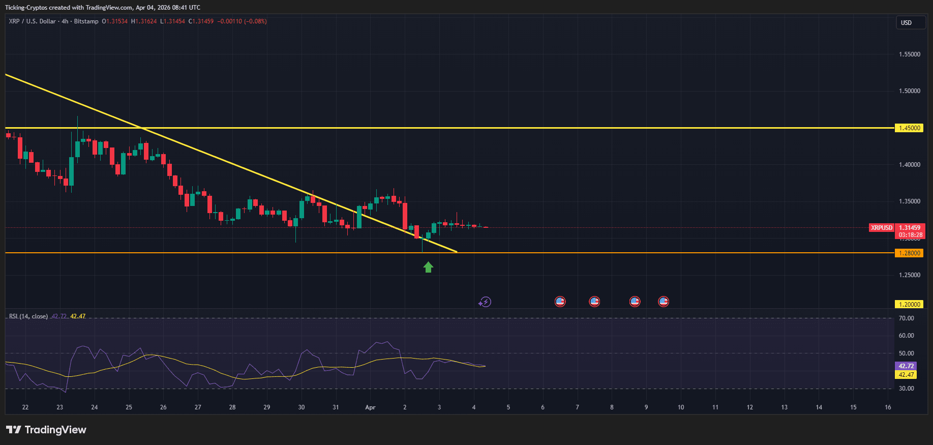 As of April 4, 2026, the $XRP price (referenced against major pairs) is trading near the $1.31 mark. Following a rejection at the $1.60 resistance level in late March, the token has entered a period of consolidation. Technical indicators like the Money Flow Index (MFI) are currently hovering around 35, suggesting that $XRP is approaching oversold territory.