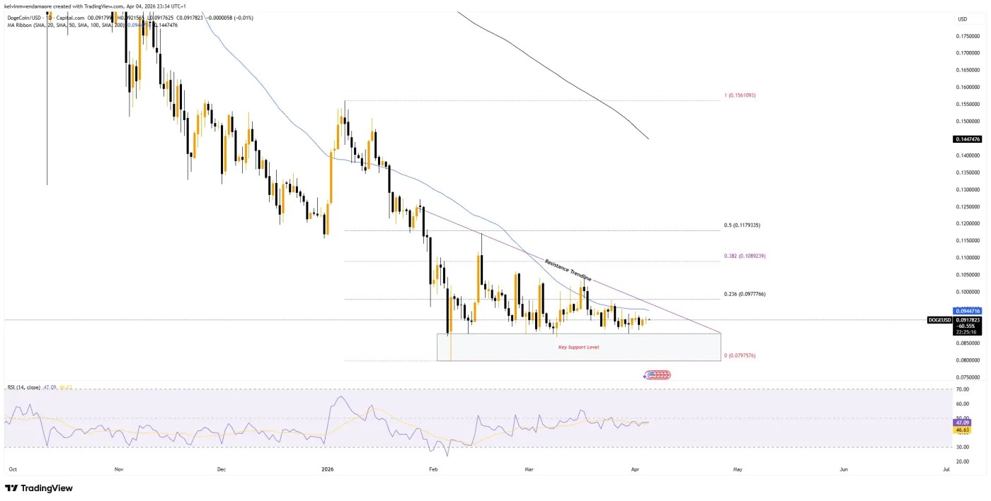 The daily chart showed $DOGE/USD trading just below the 0.236 Fibonacci retracement at $0.0978 after repeatedly stalling near the $0.09 area. Higher retracement levels were marked at $0.1089, $0.1179, and $0.1561, leaving several overhead markers above the current price. A descending resistance trendline and major moving averages also stayed above the market, including a long-term average near $0.1447.