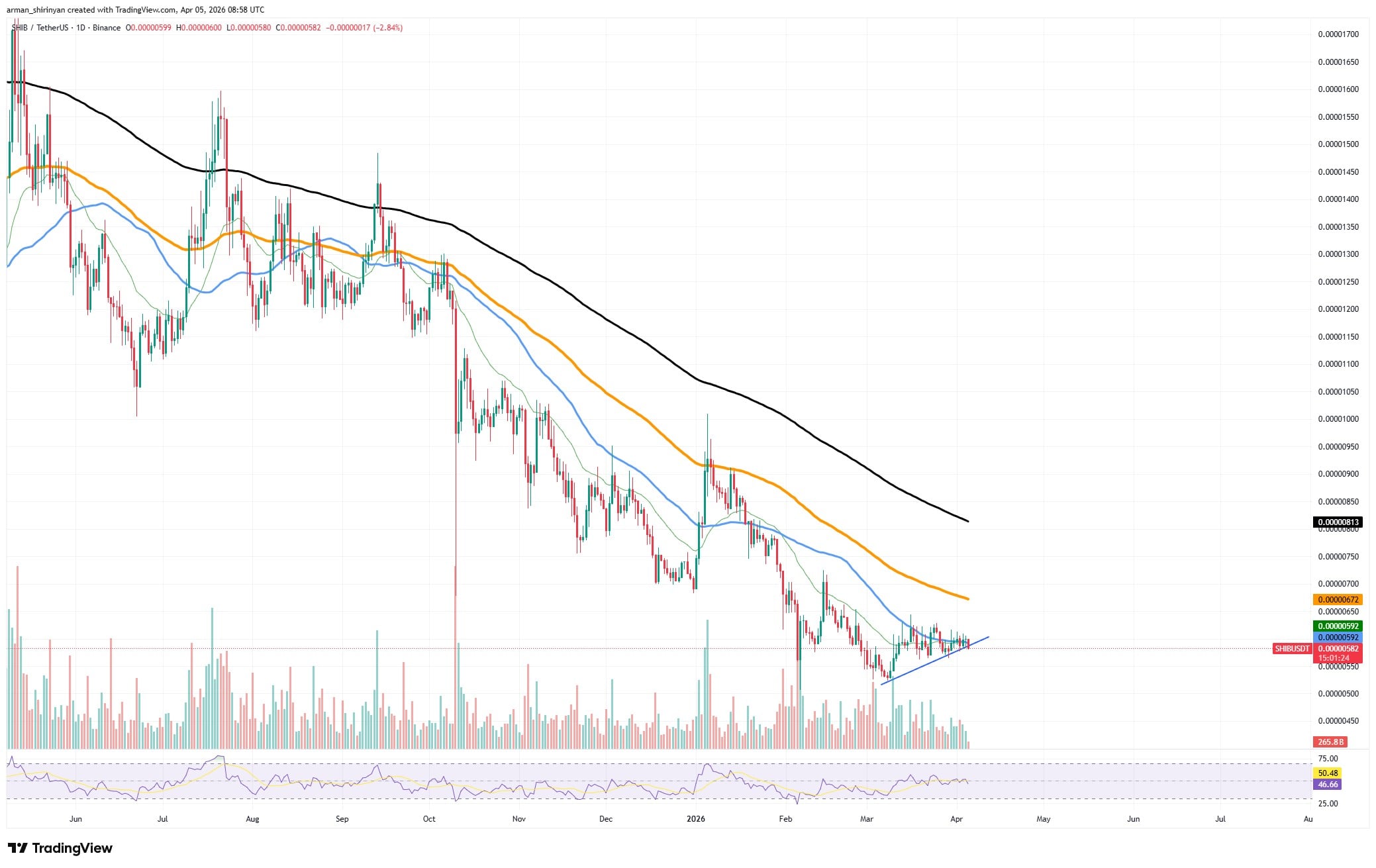 Important levels to keep an eye on have now moved down. The breakdown occurred between $0.0000060 and $0.0000062, where immediate resistance is located. This area will probably act as resistance going forward unless $SHIB can swiftly retake it. The next significant support on the downside is located closer to the $0.0000053-$0.0000055 range.