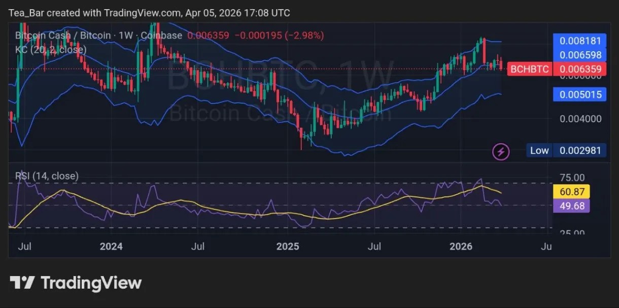 Meanwhile, the BCHBTC weekly pair, timestamped at 17:08 UTC, trades at 0.006359, down 2.98%.