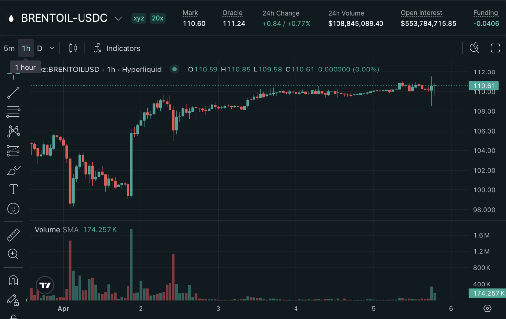 Decentralized markets offered their own read on the situation. On Hyperliquid, the XYZ:CL WTI perpetual contract was trading between $112.56 and $113.63, with open interest reaching $575 million to $593 million. The 24-hour volume on the onchain platform ran between $156 million and $237 million, with a funding rate slightly negative, meaning shorts were receiving modest payments from long holders.