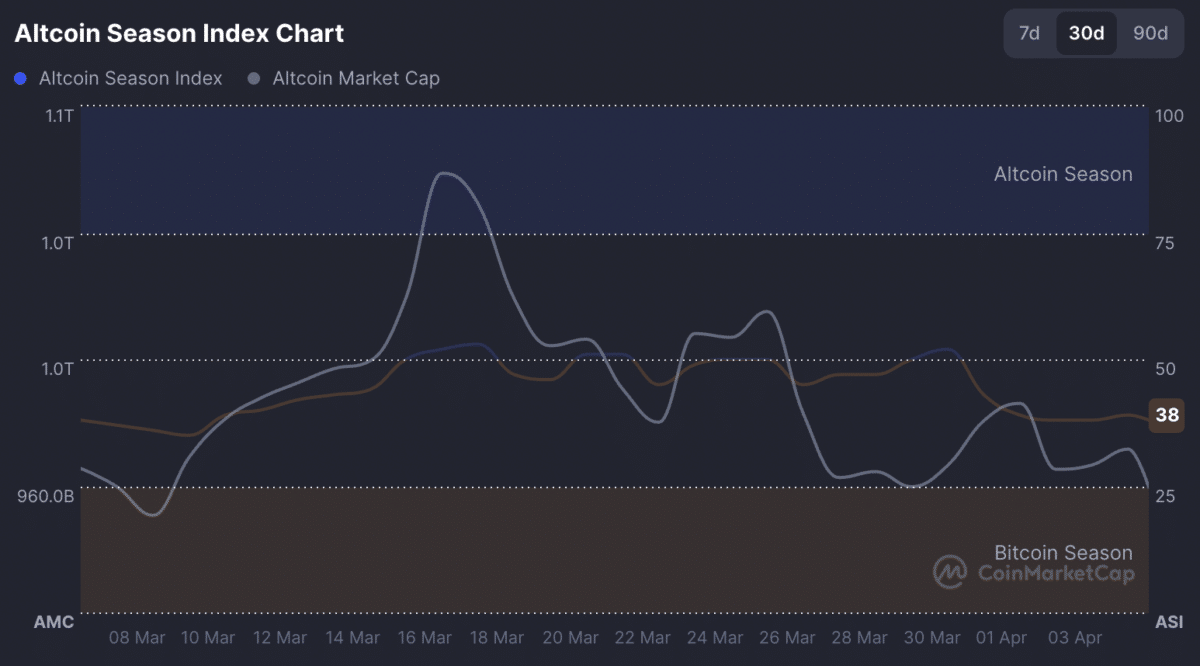 This was further supported by the Bitcoin Dominance ($BTC.D) chart, which was trading at 58.79%, indicating that Bitcoin was still ruling in comparison to altcoins. A closer look at the altcoin index chart shows that by the end of Q1 2026, altcoins appeared poised to shift market dynamics. Instead, weak sentiment led to a pullback.