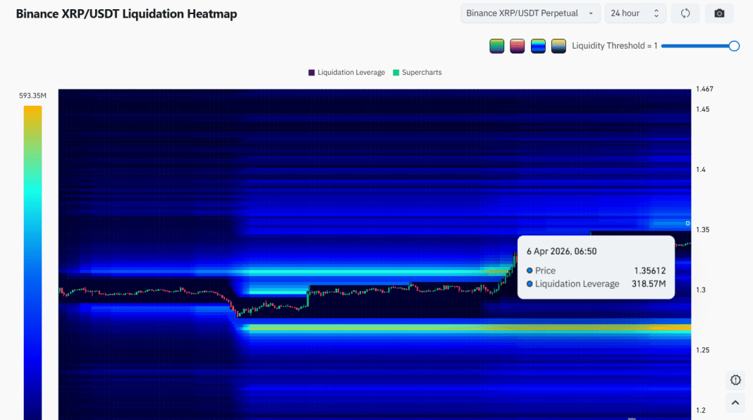 Elsewhere, the liquidation heatmap provided by Coinglass for the Binance $XRP/USDT pair shows a large number of liquidation levels sitting above the current price.