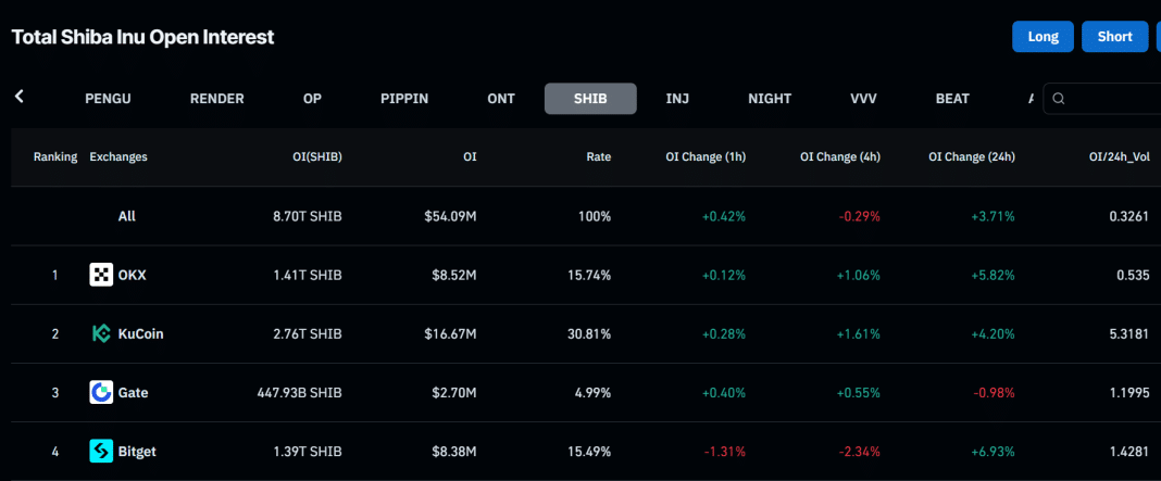 Data from Coinglass shows that the Shiba Inu open interest (OI) has increased 3.7% in the past 24 hours to 8.7 trillion $SHIB. Notably, its dollar valuation stands at $53.86 million.