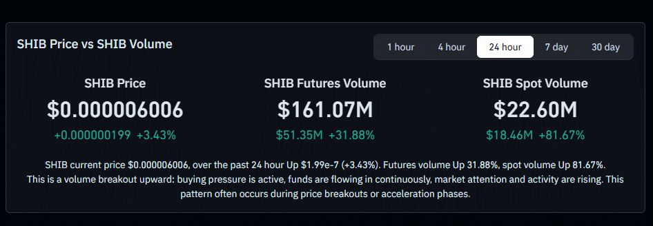 A breakdown of the volume shows that Shiba Inu’s futures volume has increased 31.8% to $161.07 million, adding $51.35 million in the past day. The taker buys stand at 50.81%, and the taker sells at 49.19%, suggesting that the futures volume is biased towards further price growth.