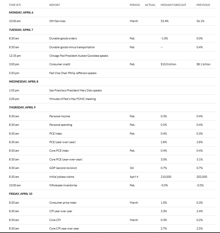 The sequence begins with the Federal Open Market Committee (FOMC) minutes on Wednesday, followed by February Personal Consumption Expenditures (PCE) inflation and Q4 Gross Domestic Product (GDP) data on Thursday, and ends with March Consumer Price Index (CPI) on Friday.