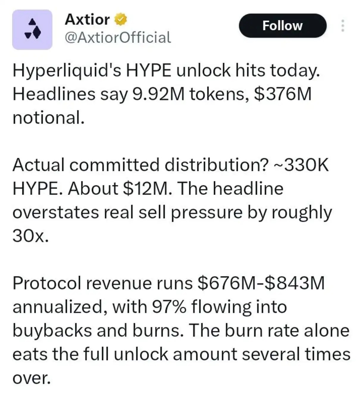 @AxtiorOfficial highlighted on X that the committed 330,000 $HYPE adds limited immediate selling pressure compared to earlier fears of a near-$375 million release.