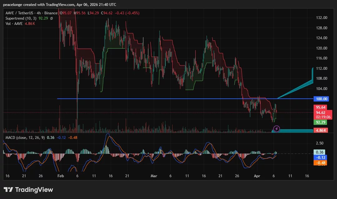 $AAVE (Aave) price crashed to $83.92 on April 6, sliding more than 11% from the prior session’s close of $94.15 before recovering to $94.66, as DeFi sector selling and broader macro risk-off sentiment pressured the Aave lending protocol’s native token. The drop confirmed a decisive break below the $100 psychological support, a level the daily chart now labels as resistance following months of acting as a structural floor.