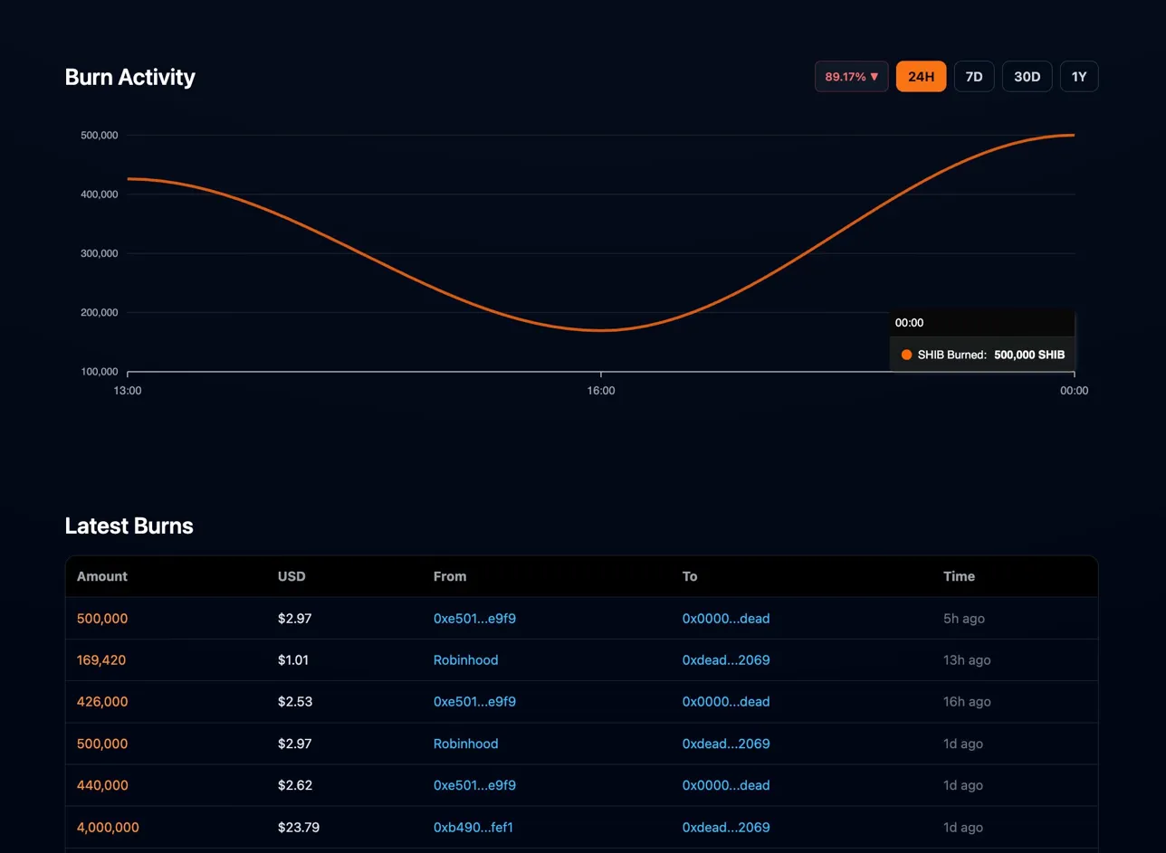 The 24h burn rate fell 89.17% with burn activity dropping sharply through the afternoon before recovering toward 500,000 $SHIB per hour by midnight.