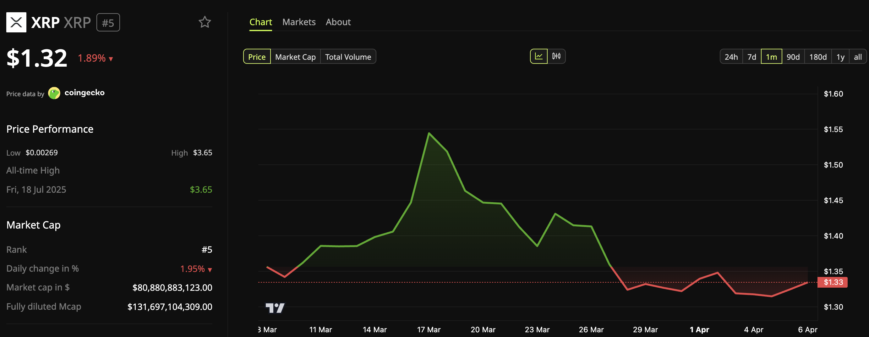 For now, the altcoin continues to move in lockstep with the broader market. BeInCrypto Markets data showed that $XRP fell 1.89% in the past 24 hours. At press time, it traded at $1.32.