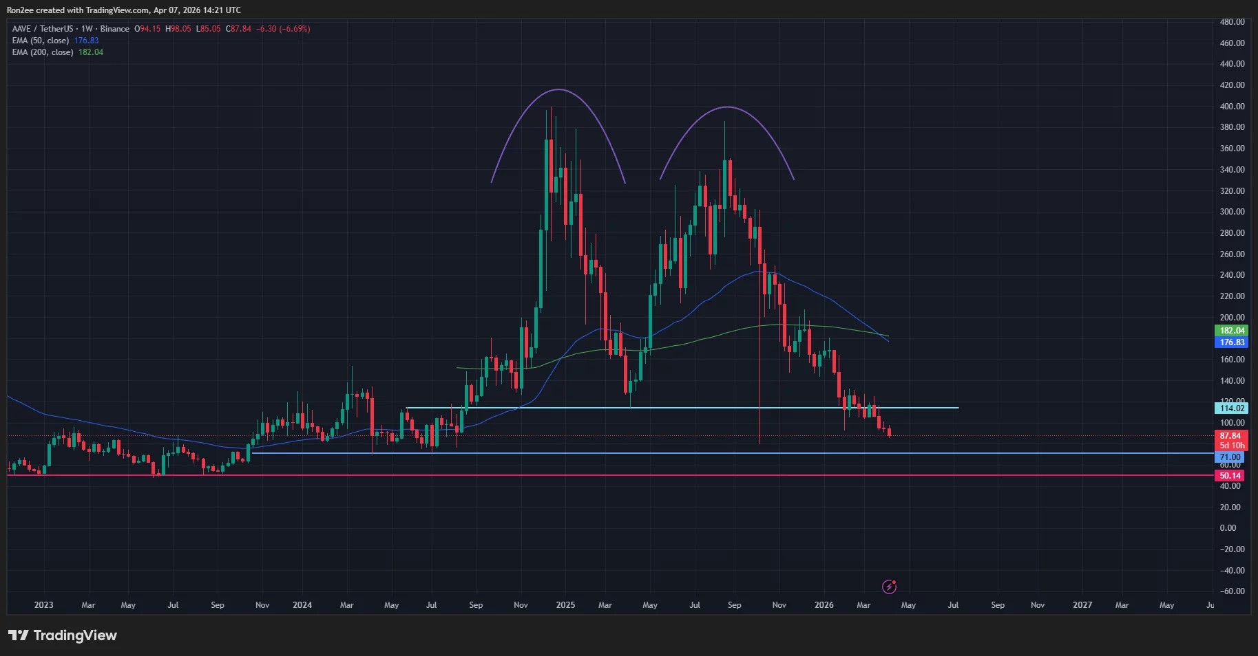 Aave price has formed a massive double top pattern, a widely tracked bearish setup in technical analysis. The breakdown below the neckline at $114 confirmed the pattern and pointed to a potential continuation of the downtrend in the coming weeks.