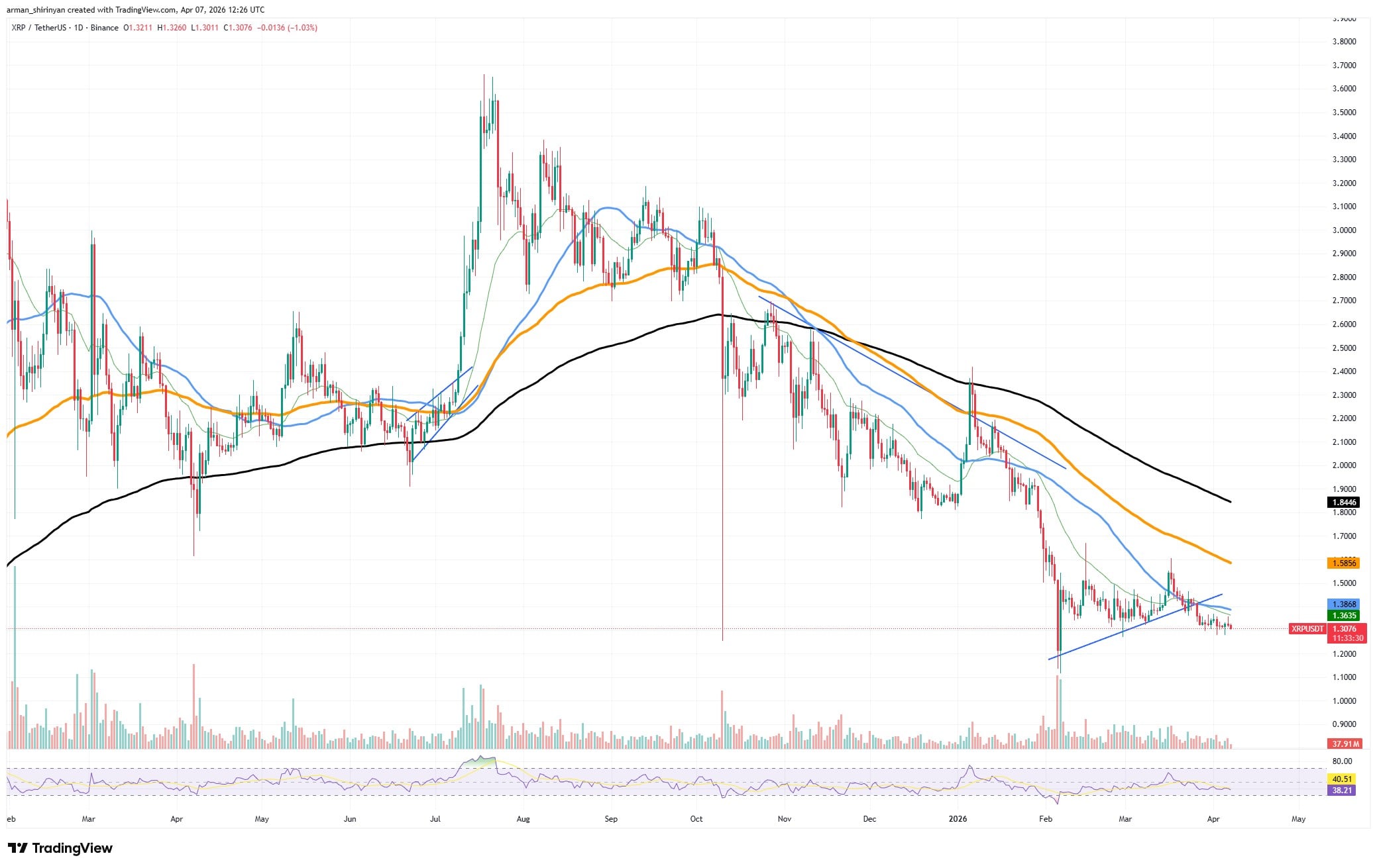 With one of its worst performance periods since FTX's demise in late 2022, $XRP is currently under a lot of strain. The asset has been continuously declining, failing to support any significant attempts at recovery, and it is still clearly in a downward trend over all significant time frames. The price of $XRP is significantly below important moving averages, and the chart continues to show lower highs and lower lows.