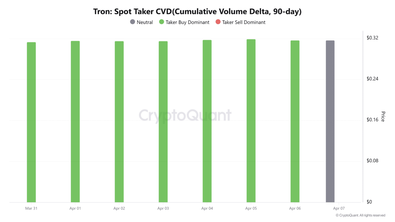 Besides the bearish outlook, Tron’s 90-day Spot Taker CVD revealed that the altcoin has seen strong buyer dominance in the market over the past week. The chart showed consecutive green bars from the 31st of March to the 6th of April, indicating aggressive buying activity.