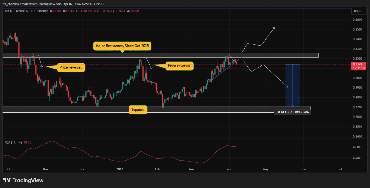 - Price action suggests that $TRX is poised for a 13% decline and may reach the $0.2705 level in the coming days.