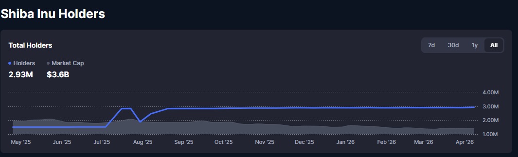 Data confirm consistent growth in this metric, with $SHIB holders having nearly doubled from 1.5 million a year ago to 2.93 million today. This shows persistent traction despite a 45.8% price decline during this period.