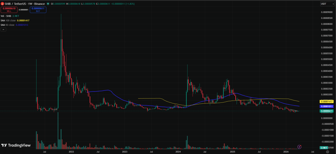 - At the time of writing, its price has crashed by 93% from the 2021 peak, now trading at $0.00000613.