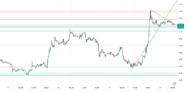 If the bulls fail to clear the red resistance and the green ascending support line near $9.05 is lost, a retracement to the $8.80 liquidity zone is highly probable. Our price prediction suggests a failure to hold the $8.60 structural floor would be technically damaging, potentially extending the weekly correction toward the $8.40 mark.
