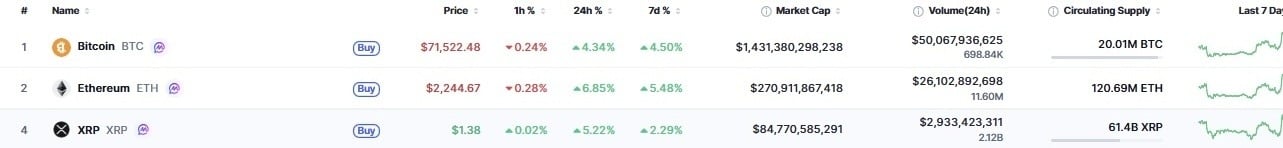 Over the past 24 hours, Bitcoin price gained more than 4% to trade above $71,522 at the time of publication. Ethereum ($ETH) rallied nearly 7% to hover at approximately $2,244 at press time. Meanwhile, $XRP, the native token for $XRP Ledger, surged over 5% on Wednesday to reach $1.38 at the time of reporting, according to metrics from CoinMarketCap.