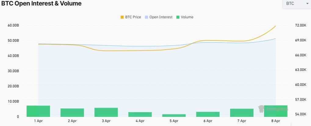 For instance, Bitcoin’s Open Interest (OI), the net value of active contracts held by traders across all exchanges, surged from $48 billion on April 1 to around $51.45 billion today, based on analytics from CoinGlass.