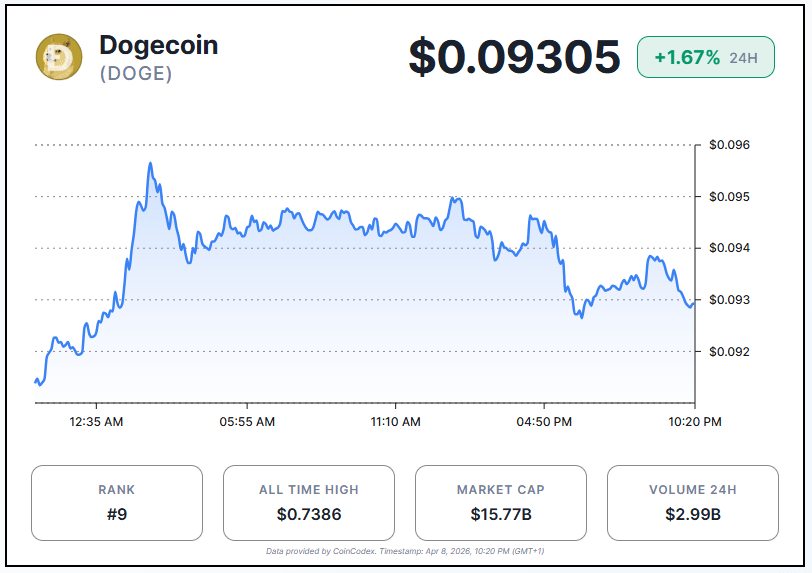 At the time of writing, Dogecoin trades at around $0.09305, up 1.67% in the last 24 hours.