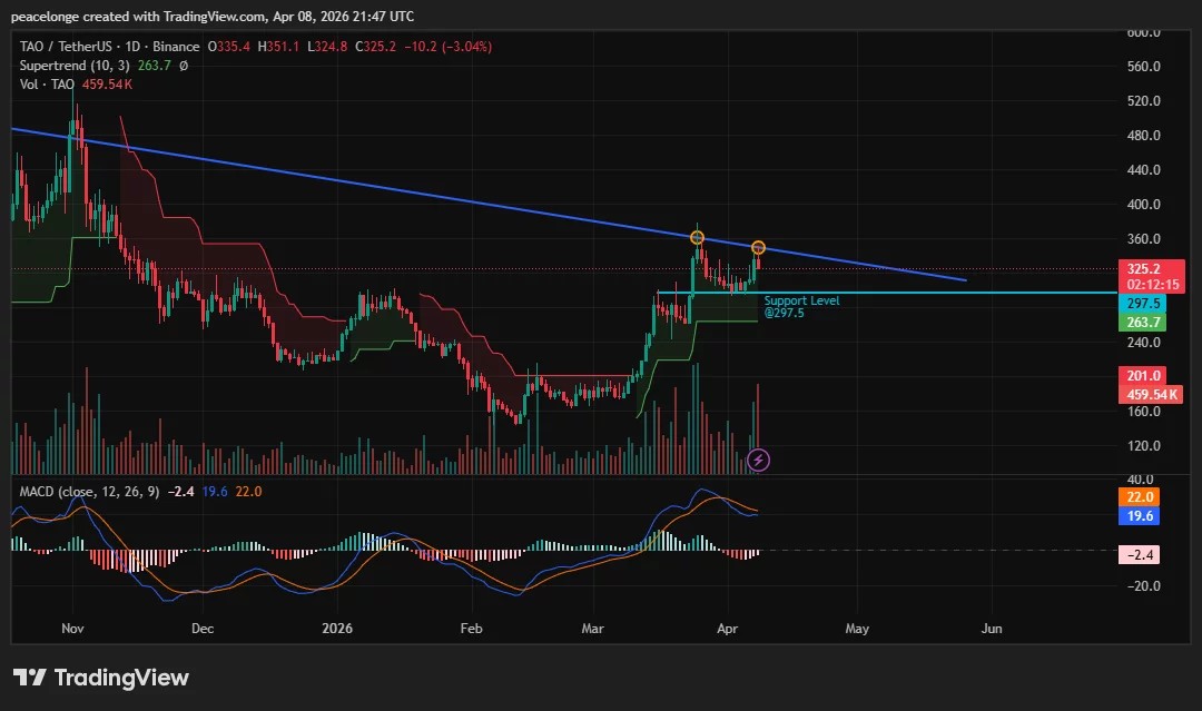 Bittensor price is trading at $325.1, down 3.04% on the day, after rejecting a multi-month descending trendline for the second time in two weeks — and the daily MACD has now confirmed a bearish crossover that shifts the near-term bias toward the downside.