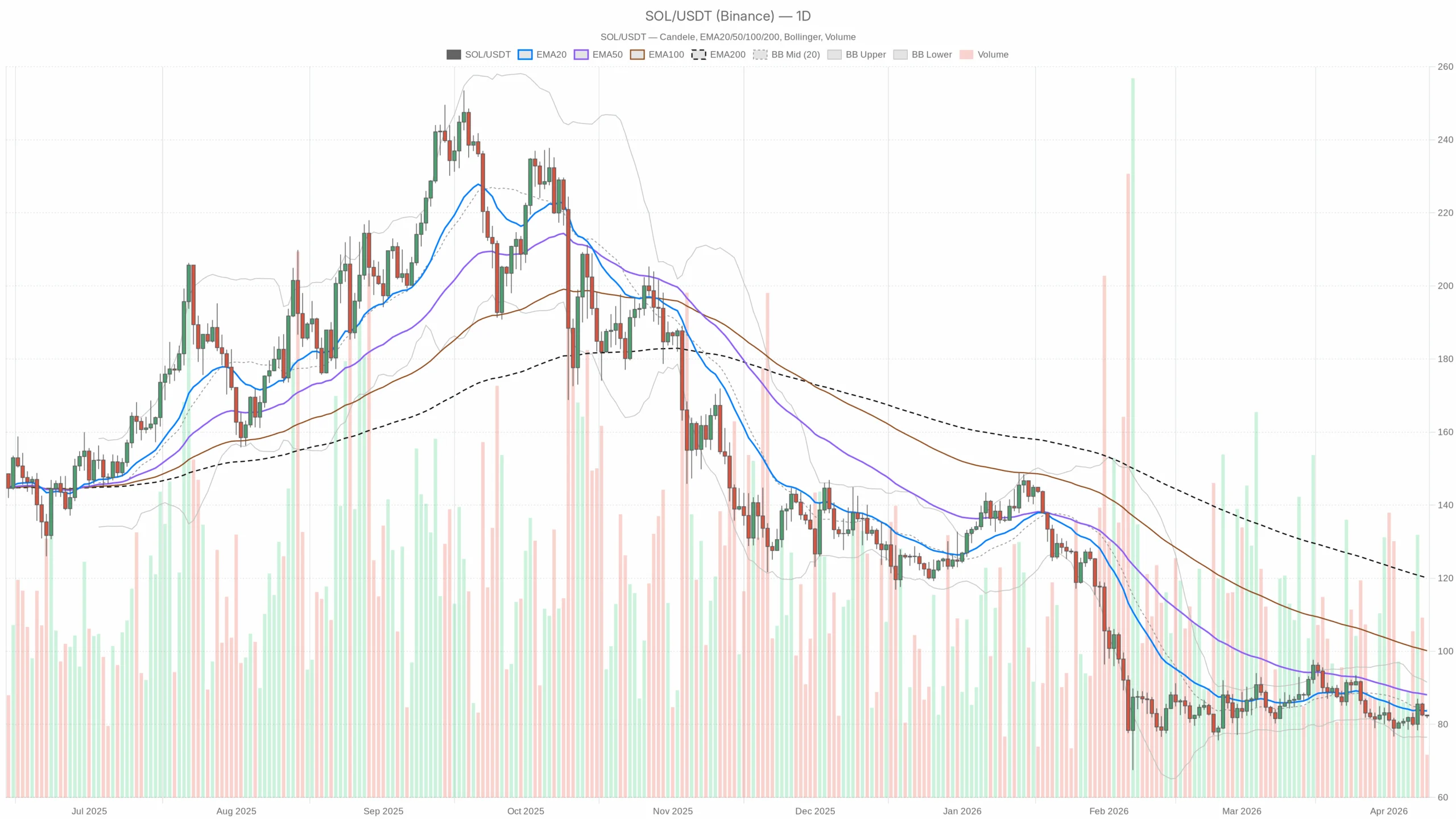 $SOL/$USDT — daily chart with candlesticks, EMA20/EMA50 and volume.