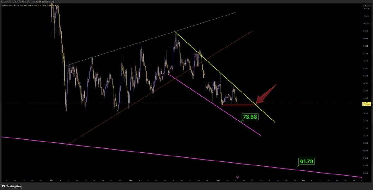 However, if $SOL loses that support box, the chart suggests a move toward $73.68 could come next. Below that, the larger pink trendline near $61.78 remains the broader downside level on the chart. So while the wedge gives bulls a possible reversal structure, support still needs to hold before that idea gains strength.